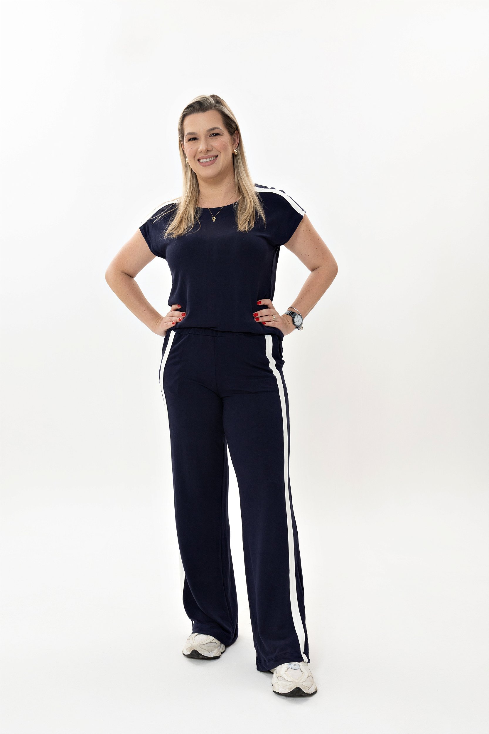 Diferencial: Duas listras brancas verticais nas laterais das pernas (estilo track pants), que alongam a silhueta e complementam o visual atlético chic.